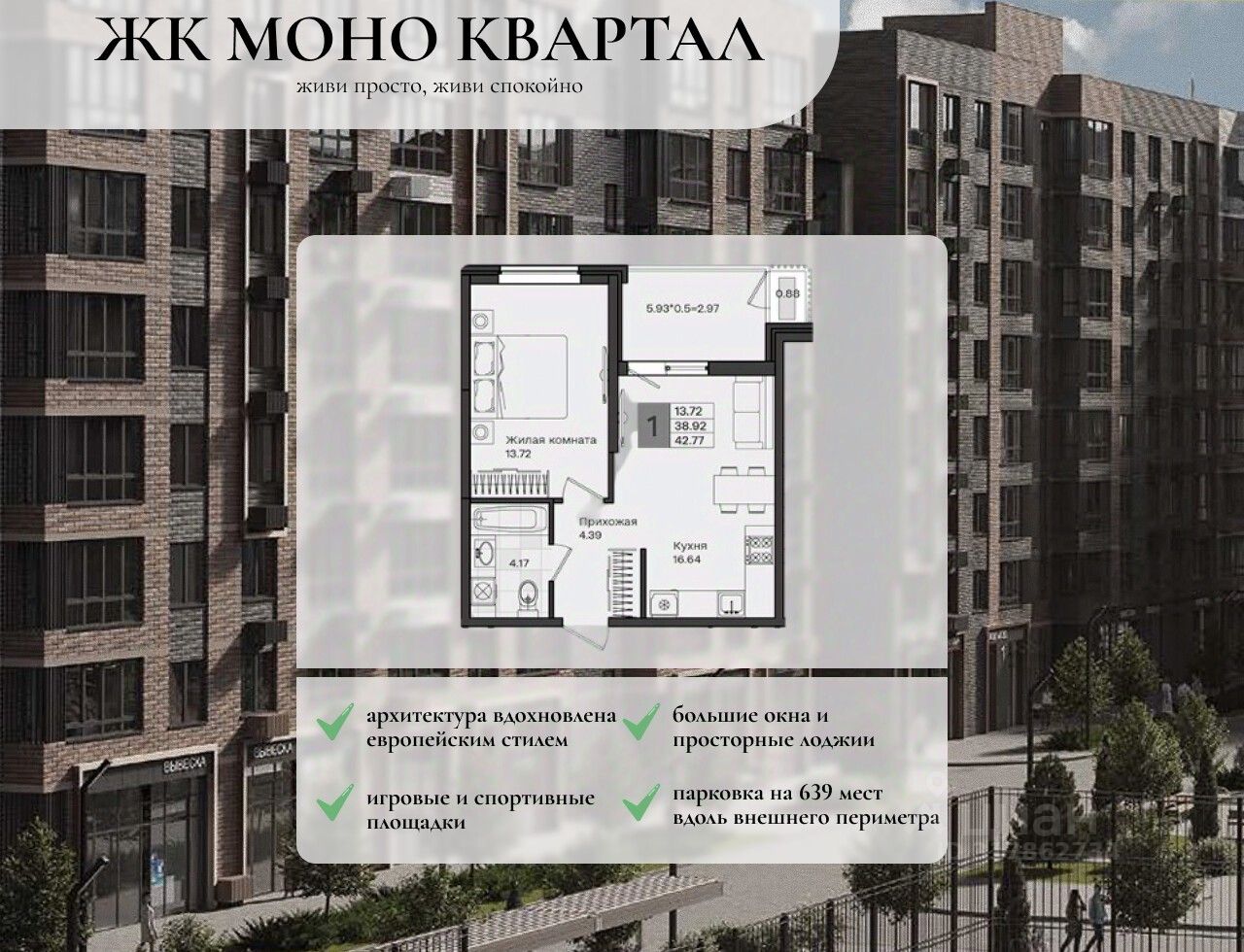 В комплексе представлено множество эргономичных планировок для студий и квартир с 13 спальнями. Квартиры идут в подчистовой отделке, с потолками высотой 2,75 метра, большими окнами и просторными лоджиями.