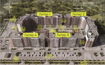 Благоустроенный двор включает: игровые площадки для детей, спортивные площадки, велодорожки, места для отдыха и прогулочные аллеи. На первых этажах находятся коммерческие помещения. Для владельцев автомобилей предусмотрена парковка на 639 мест вдоль внешнего периметра.