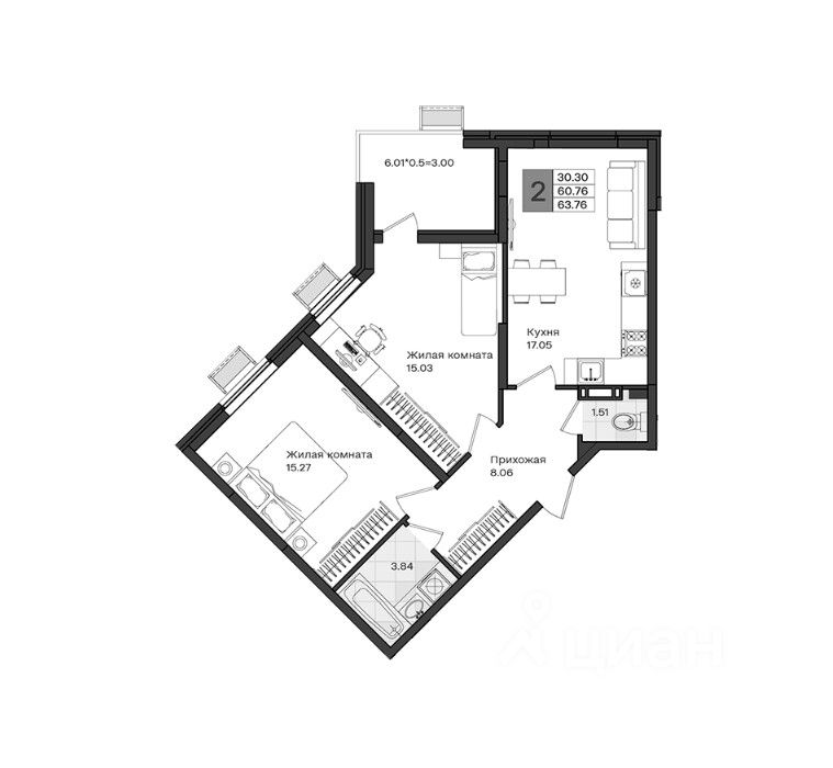Общая площадь63,76 м²