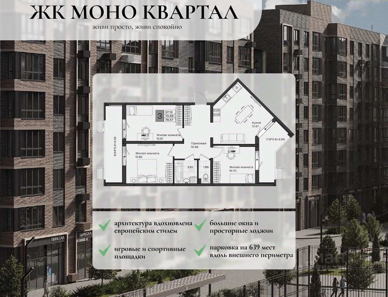 В комплексе представлено множество эргономичных планировок для студий и квартир с 13 спальнями. Квартиры идут в подчистовой отделке, с потолками высотой 2,75 метра, большими окнами и просторными лоджиями.