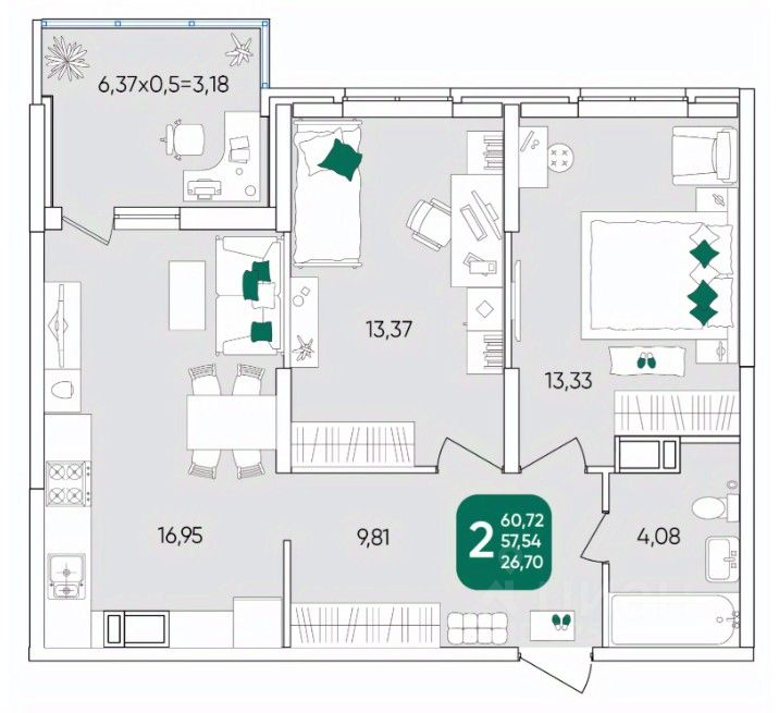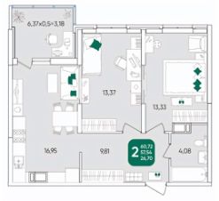 Кухня площадью 17 м² станет настоящим центром вашей домашней жизни, где легко разместится вся семья во время приготовления вкусных блюд. Две уютные комнаты площадью 27 м², с максимальной функциональностью.