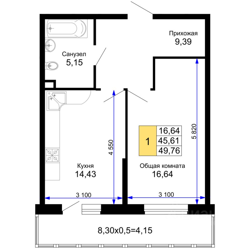 Общая площадь49,76 м²
