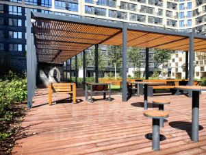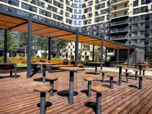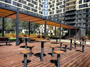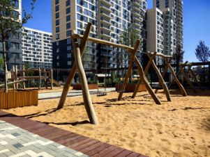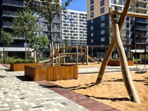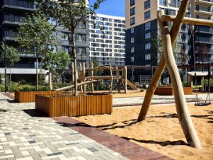ЖК отличается продуманным благоустройством: прилегающая лесопарковая территория, водоём, образовательные учреждения и спортивные площадки.