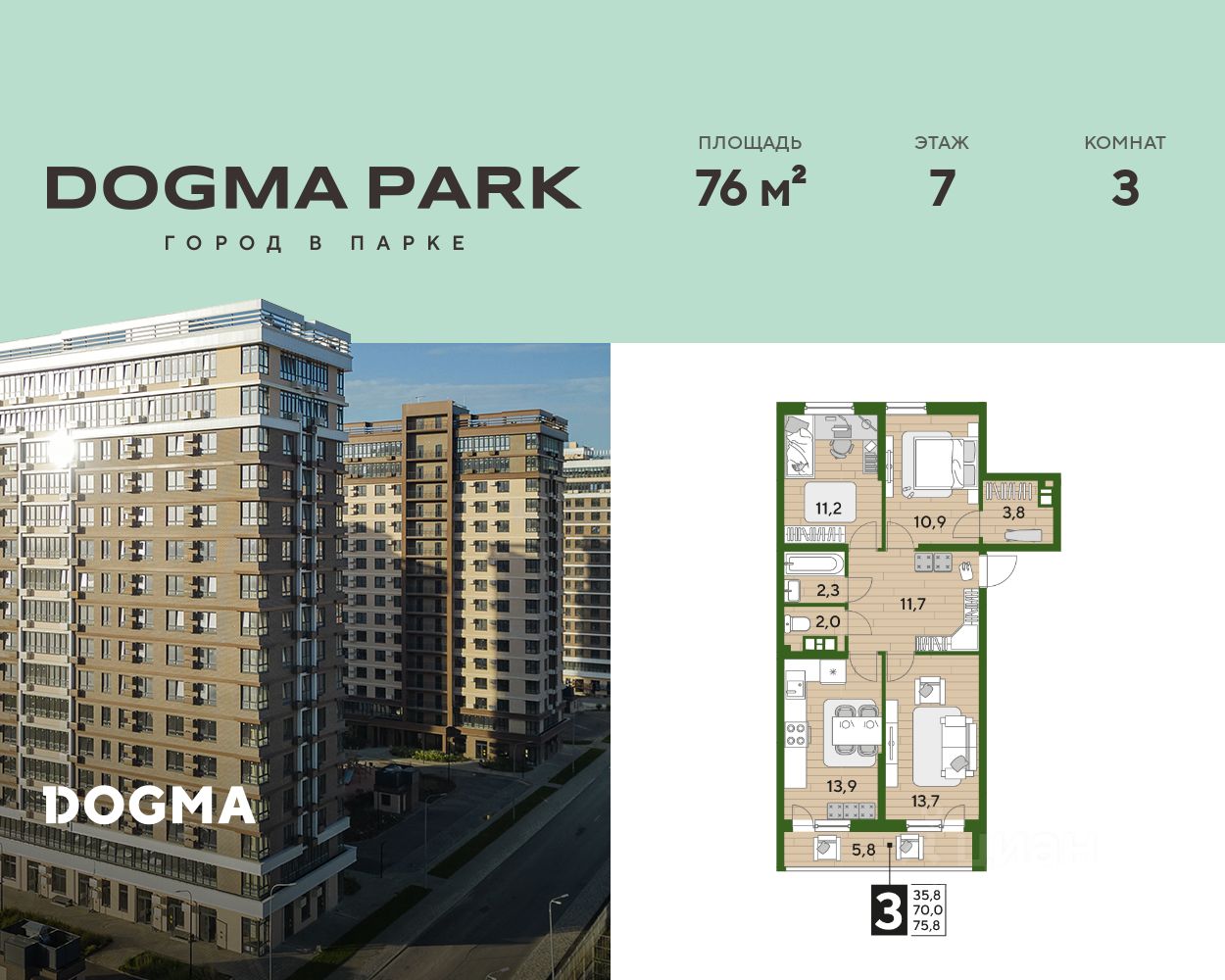 В продаже 3-комнатная квартира от застройщика! Мкр. "DOGMA PARK" г. Краснодар, Литер 21 Срок сдачи: 4 кв. 2027, общей площадью 76 кв.м., на 7 этаже.