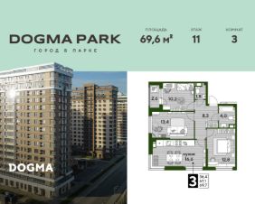 В продаже 3-комнатная квартира от застройщика! Мкр. "DOGMA PARK" г. Краснодар, Литер 21 Срок сдачи: 4 кв. 2027, общей площадью 69.6 кв.м., на 11 этаже.