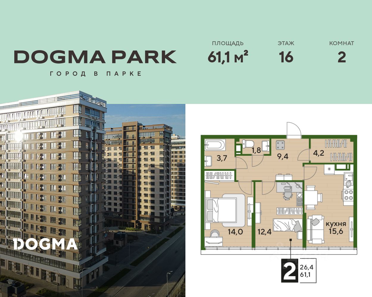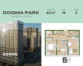 В продаже 2-комнатная квартира от застройщика! Мкр. "DOGMA PARK" г. Краснодар, Литер 22 Срок сдачи: 4 кв. 2027, общей площадью 61.1 кв.м., на 16 этаже.