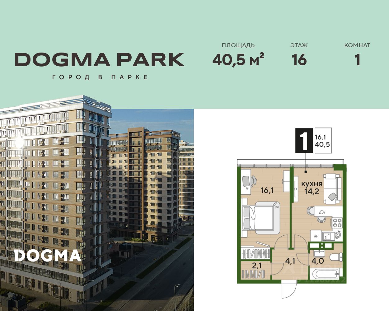 В продаже 1-комнатная квартира от застройщика! Мкр. "DOGMA PARK" г. Краснодар, Литер 22 Срок сдачи: 4 кв. 2027, общей площадью 40.5 кв.м., на 16 этаже.