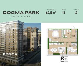 В продаже 2-комнатная квартира от застройщика! Мкр. "DOGMA PARK" г. Краснодар, Литер 22 Срок сдачи: 4 кв. 2027, общей площадью 62.5 кв.м., на 16 этаже.