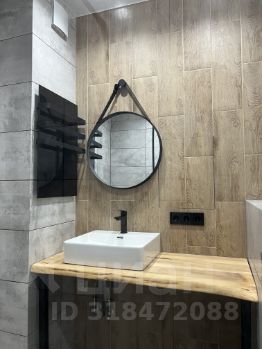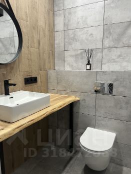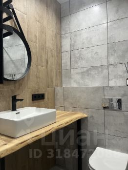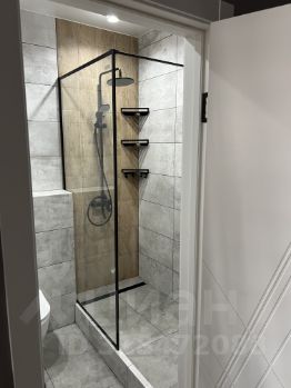 Санузел — как из журнала по интерьеру! Современный ремонт: душ с чёрной сантехникой, стеклянная перегородка, плитка под бетон и дерево, стильная раковина на столешнице из натурального дерева ( слэб) под заказ.
