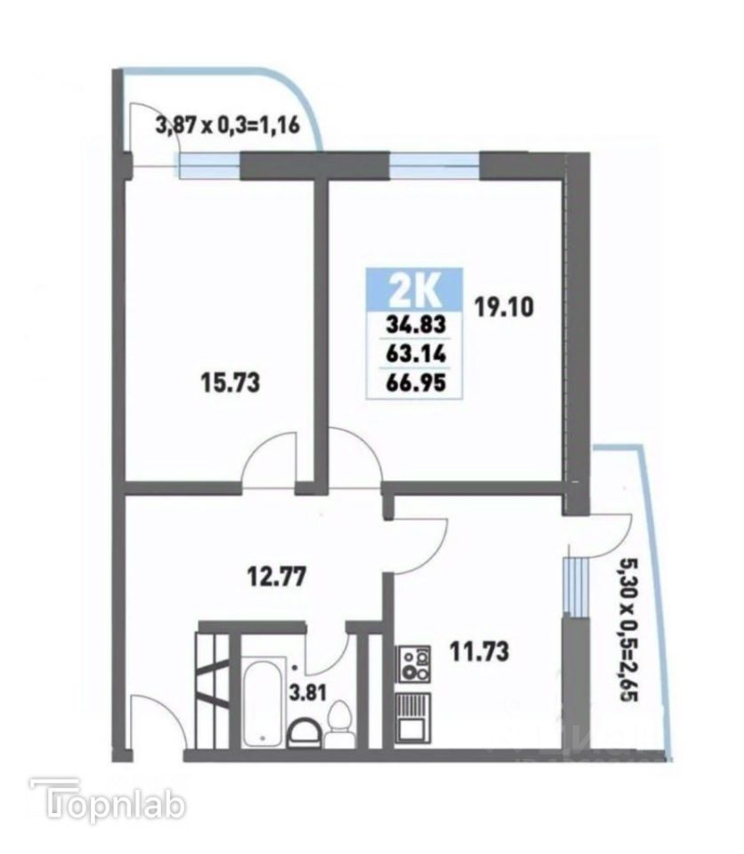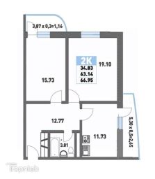 на 12 этаже общей площадью 66,95 ( в выписке из ЕГРН указана площадь без учета балконов - 63,4м2)