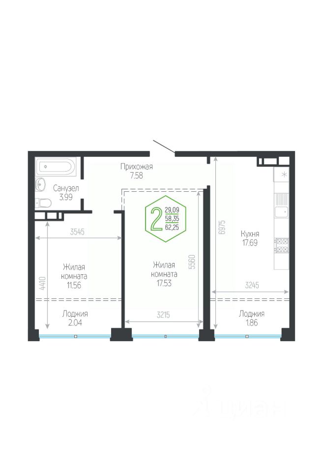 Общая площадь62,25 м²