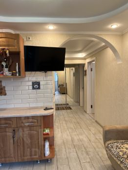 Продается уютная трехкомнатная квартира в Туапсе, на Новороссийском шоссе, 1. Общая площадь составляет 76 кв. м, жилая площадь — 45 кв. м, а кухня — 11 кв. м. Квартира находится на 7 этаже 10-этажного панельного дома, построенного в 1979 году. Из окон открываются виды как на улицу, так и во двор.