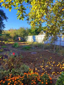 На территории есть большой участок с плодовыми и фруктовыми деревьями.