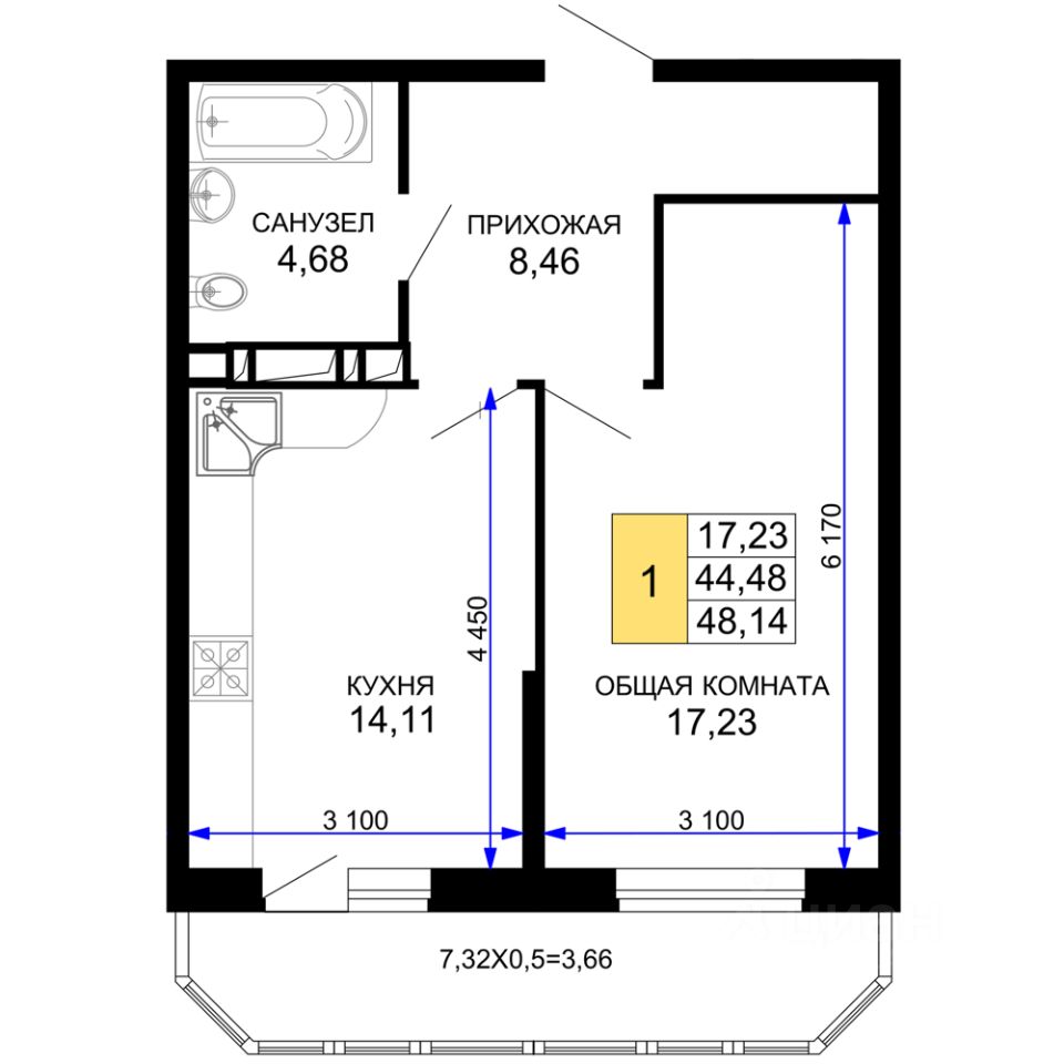 Общая площадь45,7 м²