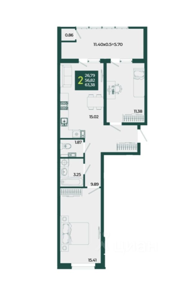 В продаже стильная 2 комнатная квартира с большой кухней 15.02 м2 с выходом на ленточную лоджию 11.40. м2, прихожая 9.89 м2 с зоной для гардероба.