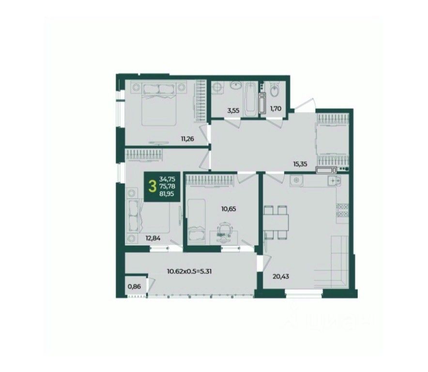 В продаже стильная 3 комнатная квартира с большой кухней 20.43 м2 с выходом на ленточную лоджию 10.62м2,прихожая 15.35 м2 с зоной для гардероба.