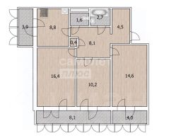 Очень светлая, 67.3 кв. м, улучшенной планировки, комнаты раздельные - 14.6 кв. м, 10.2 кв. м, 16.4 кв. м, из каждой комнаты выход на лоджию, кухня - 9 кв. м, из которой также есть выход на отдельную лоджию, благодаря чему кухня становится еще просторнее.