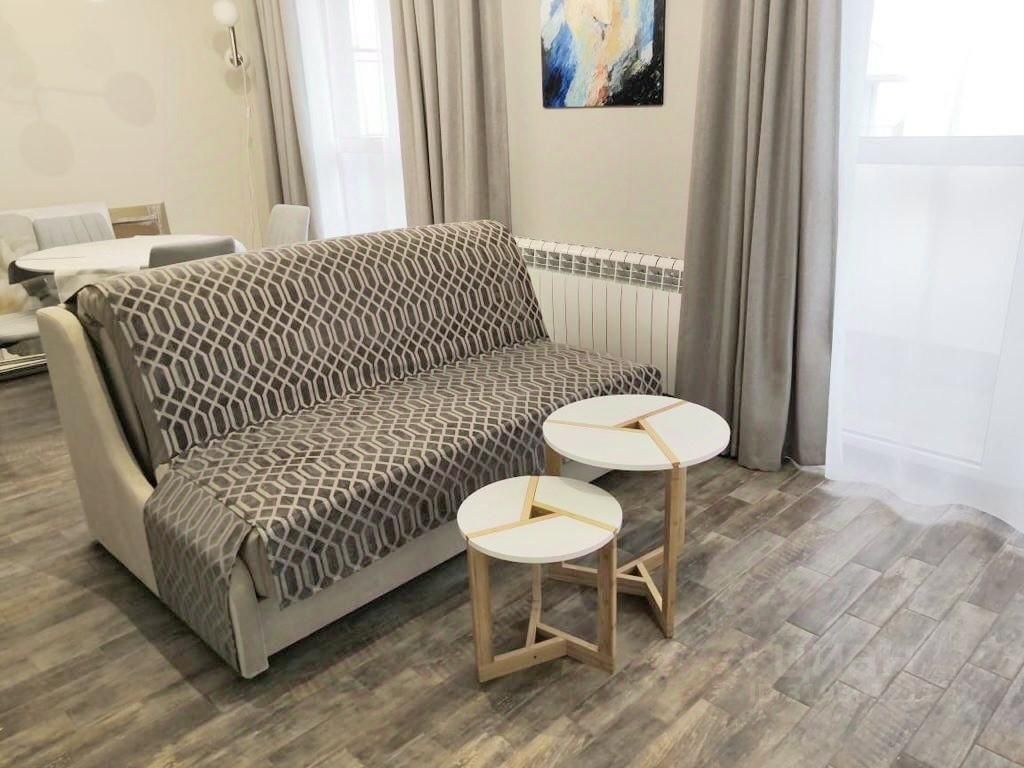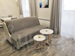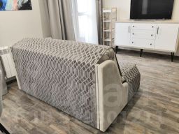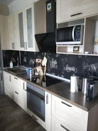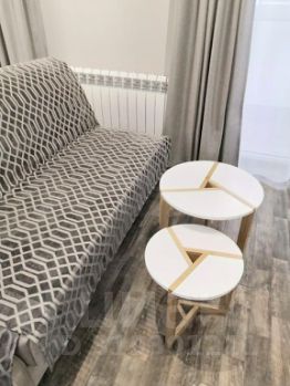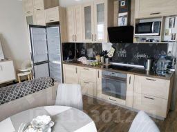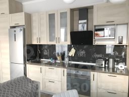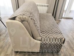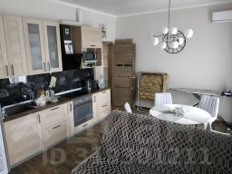 В кухне-гостиной установлен инверторный кондиционер, кухонный гарнитур со встроенной техникой, микроволновая печь, кофеварка Nescafe, кулер для питьевой воды. Вся необходимая посуда также остается в подарок новым владельцам. Диван-кровать фирмы Аскона с ортопедическим матрасом размером 140 на 200, жесткая раскладушка для размещения 3-го отдыхающего; стол обеденный, 4 стула, Smart телевизор, гладильная доска, утюг.