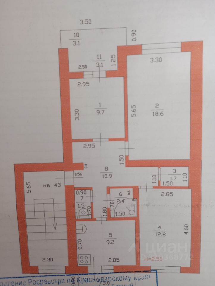 Высокие потолки 2.7 метра создают ощущение простора. Жилая площадь составляет 44.2 кв. м, просторная кухня — 9 кв. м. Окна выходят как на улицу, так и во двор, поэтому в квартире всегда светло и уютно.