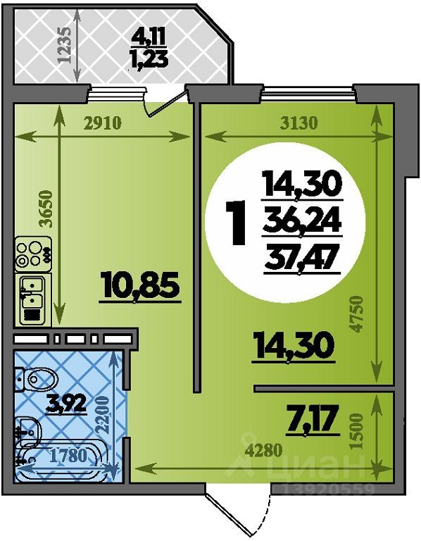Продаётся 1-комнатная квартира в сданном доме (Литер 14), срок сдачи: I-кв. 2025, общей площадью 37.47 кв.м., на 4 этаже. РАСПОЛОЖЕНИЕ