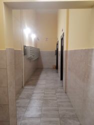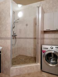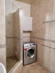 Ванная комната со всем необходимым - душевая кабина, ванна, раковина, стиральная машина LG на 7 кг. На месте стиральной машины есть подводка электричества, воды, канализации.