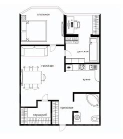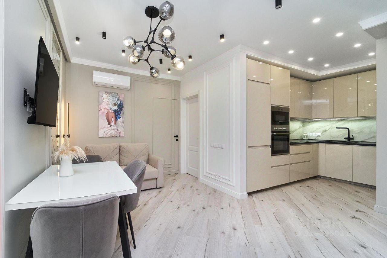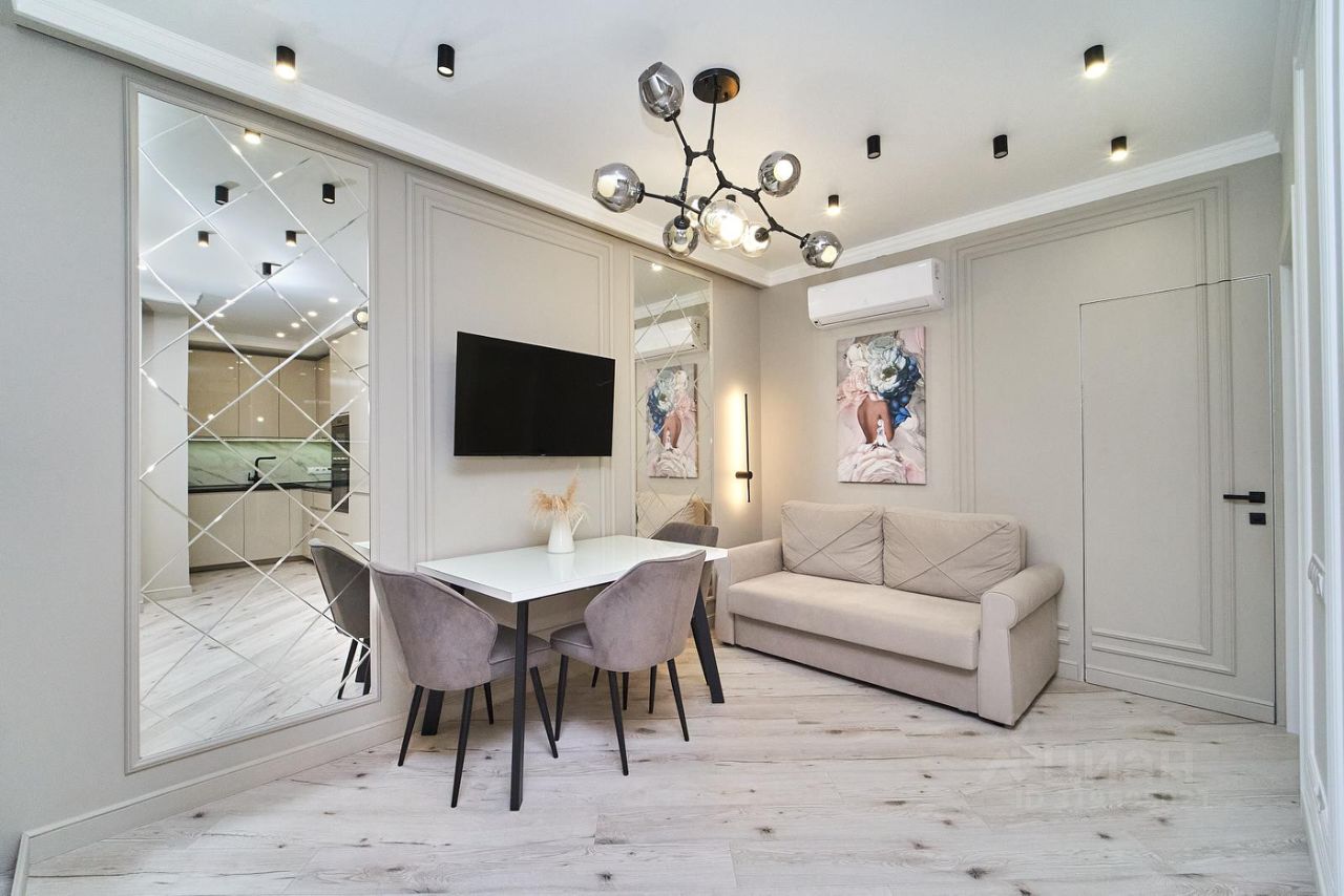 Кухонный гарнитур выполнен по индивидуальному заказу, оснащен современной бытовой техникой от ведущих производителей. В гостиной зоне расположен удобный диван, который легко трансформируется в полноценное спальное место.