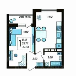 Общая площадь 35 кв.м,жилая комната 13 кв.м,кухня-14 кв.м,санузел-3,6кв.м