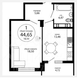 • Общая площадь: 44,65 м²
