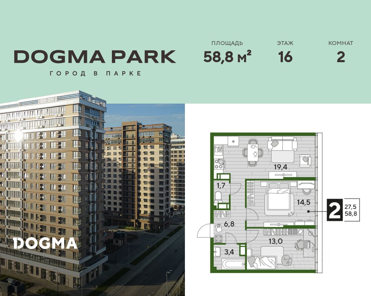 В продаже 2-комнатная квартира от застройщика! Мкр. "DOGMA PARK" г. Краснодар, Литер 24 Срок сдачи: 4 кв. 2027, общей площадью 58.8 кв.м., на 16 этаже.