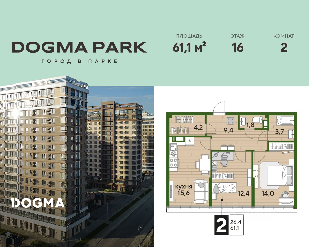 В продаже 2-комнатная квартира от застройщика! Мкр. "DOGMA PARK" г. Краснодар, Литер 24 Срок сдачи: 4 кв. 2027, общей площадью 61.1 кв.м., на 16 этаже.