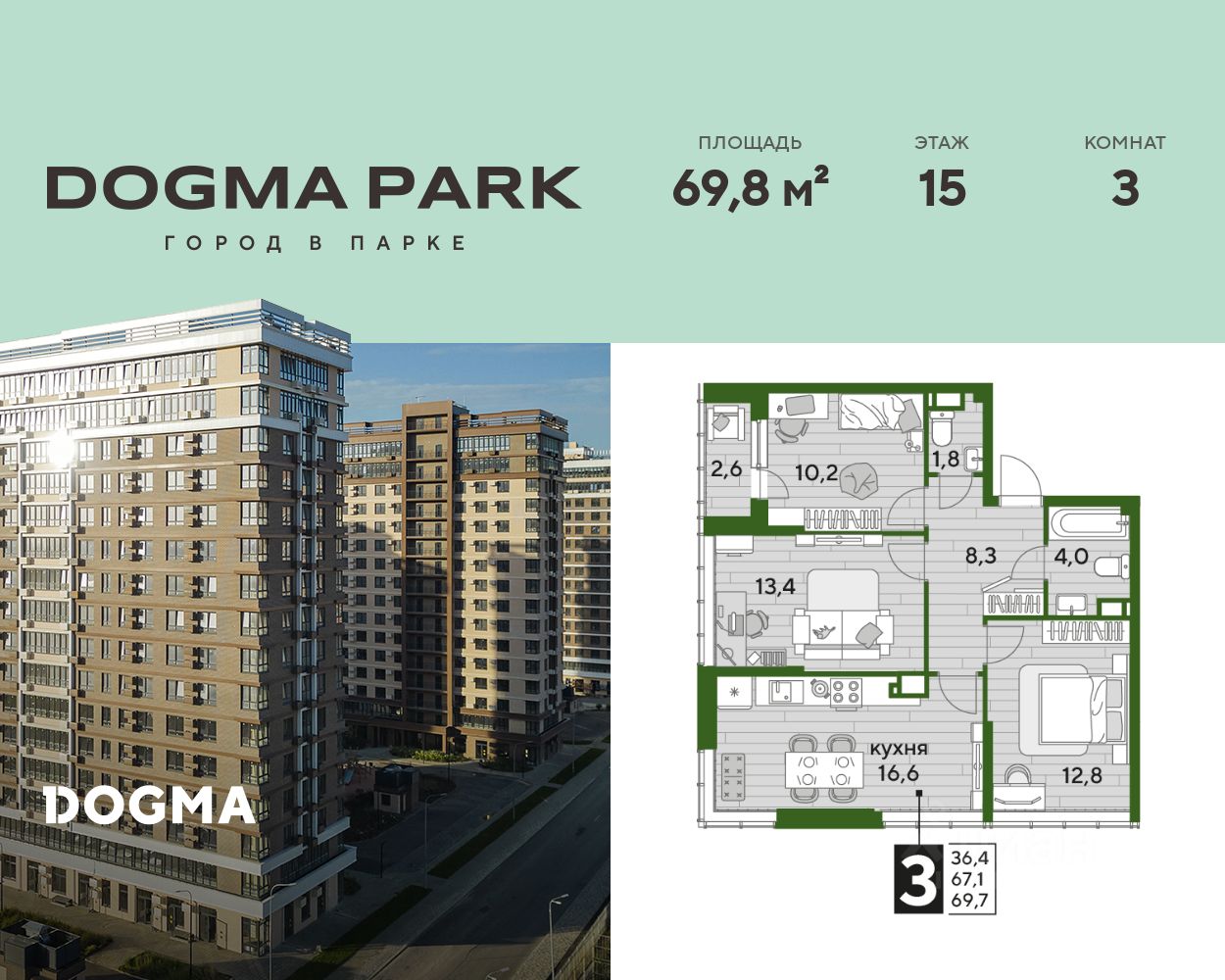 В продаже 3-комнатная квартира от застройщика! Мкр. "DOGMA PARK" г. Краснодар, Литер 24 Срок сдачи: 4 кв. 2027, общей площадью 69.8 кв.м., на 15 этаже.
