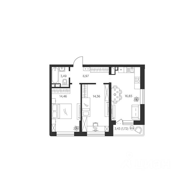 Общая площадь57,83 м²