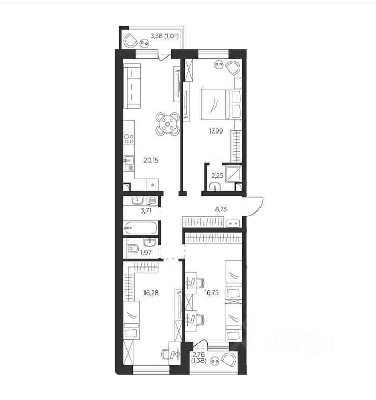 В проекте представлены планировки от 1 до 3-комнатных квартир. Сдаются они с отделкой White Вох, высотой потолков 2.68 метров и стандартными окнами. На лоджиях и балконах выполнено панорамное остекление.