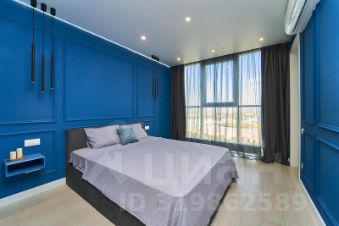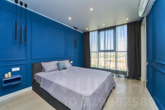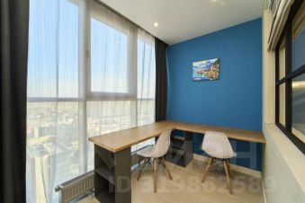Огромная кухня-гостиная площадью 40.5 м2. Зона кухни выделена отдельно, хорошо освещена не только дневным светом, но и дополнительной подсветкой. Кухонный гарнитур сделан под заказ. Установлена вся необходимая бытовая техника: духовой шкаф, индукционная варочная поверхность, микроволновая плита, посудомоечная машина, холодильник. Прямо над столешницей открывается красивый вид на город с высоты. Такой кухни больше нет ни у кого. В просторной гостиной много свободного места для приёма гостей и семейных мероприятий. Есть диван для отдыха, телевизор на стене, обеденный стол на две персоны. Центральным элементом комнаты, выполненной в аквамариновых тонах, является двуспальная кровать. Витражное остекление позволит вам встречать восход солнца и подарит красивый ночной вид на город. В комнате площадью 14.6 м2 нет ничего лишнего. Вместительный встроенный шкаф и шкаф для хранения одежды вынесены в отдельную гардеробную комнату площадью 10 м2, выполненную в светлых тонах. Эта квартира - идеальное сочетание стиля, комфорта и функциональности. В ней есть даже небольшой кабинет. Витражное остекление и шикарные видовые характеристики сделают эту уютную освещённую комнату вашим любимым рабочим местом.