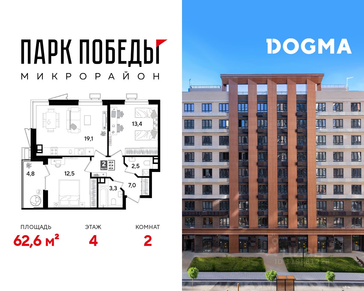 Срок сдачи: 1 кв. 2026, общей площадью 62.6 кв.м., на 4 этаже.