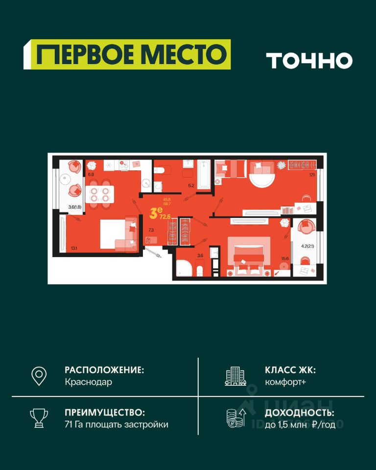 Жилой район "Первое место"- один из самых масштабных проектов в России. На территории 71 га 18 кварталов, 31 дом переменной этажности от 8 до 18 этажей, собственный парк 9 га, храмовый комплекс, пешеходный бульвар "Круг семьи", детские и спортивные площадки, мангальные зоны и различные локации для отдыха. В шаговой доступности действующие муниципальные образовательные учреждения: школа на 1 100 мест и детский сад на 250 мест. Помимо этого, в жилом районе "Первое место" построятся школа на 1700 мест с крытым 25-метровым бассейном и 5 детских садов на 1 490 мест. На первых этажах многоуровневых парковок "паркхабов" разместится более 61 тыс м2 коммерческих помещений. Жителям будут доступны собственный фитнес-центр, кафе, рестораны и магазины. В каждом подъезде предусмотрены дизайнерские холлы в стиле лобби отелей, консьерж-сервис, лапомойки, отдельные колясочные и велосипедные. Также в домах будут просторные кладовые помещения и комнаты для хранения почты с почтоматами для получения посылок из маркетплейсов.