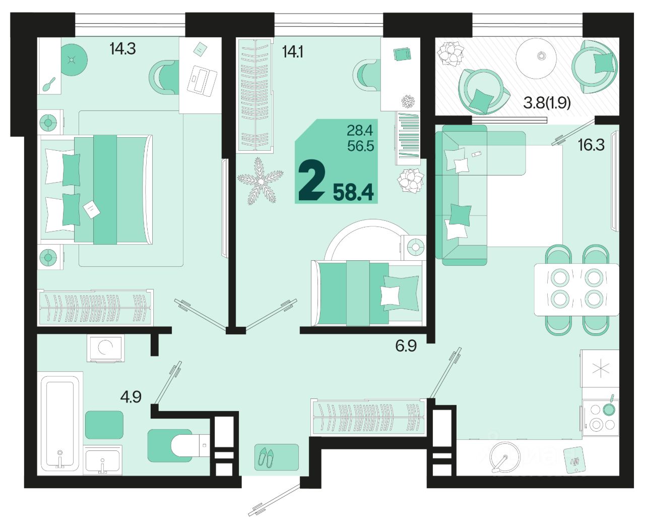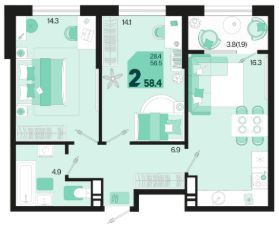 Общая площадь58,4 м²
