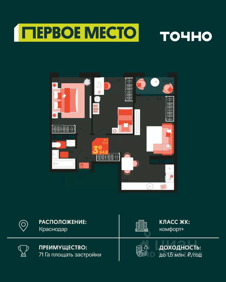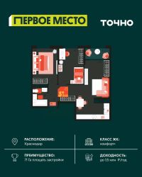 Жилой район "Первое место"- один из самых масштабных проектов в России. На территории 71 га 18 кварталов, 31 дом переменной этажности от 8 до 18 этажей, собственный парк 9 га, храмовый комплекс, пешеходный бульвар "Круг семьи", детские и спортивные площадки, мангальные зоны и различные локации для отдыха. В шаговой доступности действующие муниципальные образовательные учреждения: школа на 1 100 мест и детский сад на 250 мест. Помимо этого, в жилом районе "Первое место" построятся школа на 1700 мест с крытым 25-метровым бассейном и 5 детских садов на 1 490 мест. На первых этажах многоуровневых парковок "паркхабов" разместится более 61 тыс м2 коммерческих помещений. Жителям будут доступны собственный фитнес-центр, кафе, рестораны и магазины. В каждом подъезде предусмотрены дизайнерские холлы в стиле лобби отелей, консьерж-сервис, лапомойки, отдельные колясочные и велосипедные. Также в домах будут просторные кладовые помещения и комнаты для хранения почты с почтоматами для получения посылок из маркетплейсов.