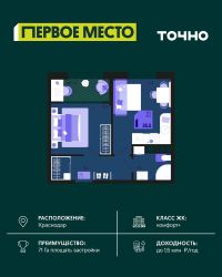 Жилой район "Первое место"- один из самых масштабных проектов в России. На территории 71 га 18 кварталов, 31 дом переменной этажности от 8 до 18 этажей, собственный парк 9 га, храмовый комплекс, пешеходный бульвар "Круг семьи", детские и спортивные площадки, мангальные зоны и различные локации для отдыха. В шаговой доступности действующие муниципальные образовательные учреждения: школа на 1 100 мест и детский сад на 250 мест. Помимо этого, в жилом районе "Первое место" построятся школа на 1700 мест с крытым 25-метровым бассейном и 5 детских садов на 1 490 мест. На первых этажах многоуровневых парковок "паркхабов" разместится более 61 тыс м2 коммерческих помещений. Жителям будут доступны собственный фитнес-центр, кафе, рестораны и магазины. В каждом подъезде предусмотрены дизайнерские холлы в стиле лобби отелей, консьерж-сервис, лапомойки, отдельные колясочные и велосипедные. Также в домах будут просторные кладовые помещения и комнаты для хранения почты с почтоматами для получения посылок из маркетплейсов.