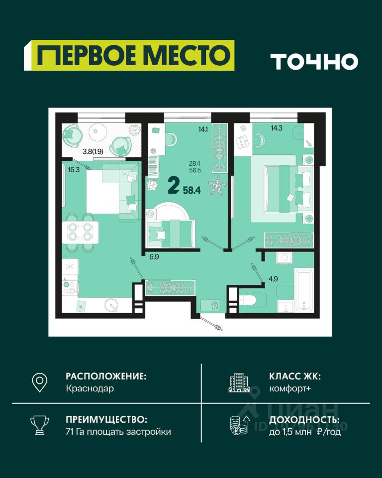 Общая площадь58,4 м²