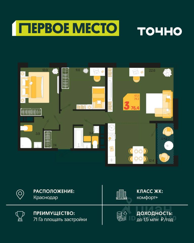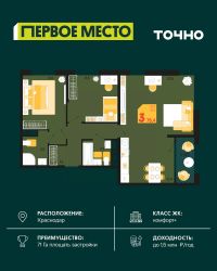 Жилой район "Первое место"- один из самых масштабных проектов в России. На территории 71 га 18 кварталов, 31 дом переменной этажности от 8 до 18 этажей, собственный парк 9 га, храмовый комплекс, пешеходный бульвар "Круг семьи", детские и спортивные площадки, мангальные зоны и различные локации для отдыха. В шаговой доступности действующие муниципальные образовательные учреждения: школа на 1 100 мест и детский сад на 250 мест. Помимо этого, в жилом районе "Первое место" построятся школа на 1700 мест с крытым 25-метровым бассейном и 5 детских садов на 1 490 мест. На первых этажах многоуровневых парковок "паркхабов" разместится более 61 тыс м2 коммерческих помещений. Жителям будут доступны собственный фитнес-центр, кафе, рестораны и магазины. В каждом подъезде предусмотрены дизайнерские холлы в стиле лобби отелей, консьерж-сервис, лапомойки, отдельные колясочные и велосипедные. Также в домах будут просторные кладовые помещения и комнаты для хранения почты с почтоматами для получения посылок из маркетплейсов.