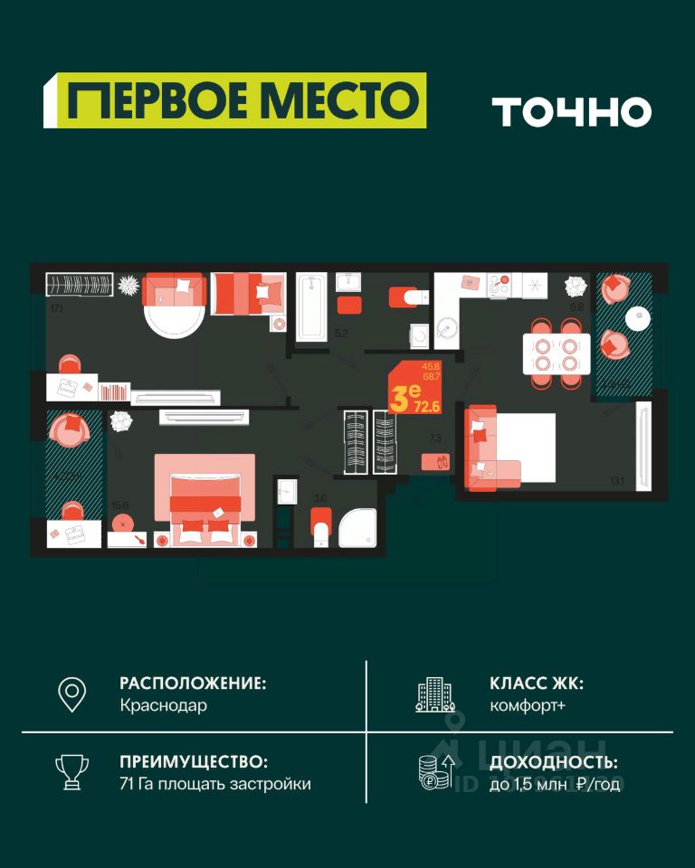 Жилой район "Первое место"- один из самых масштабных проектов в России. На территории 71 га 18 кварталов, 31 дом переменной этажности от 8 до 18 этажей, собственный парк 9 га, храмовый комплекс, пешеходный бульвар "Круг семьи", детские и спортивные площадки, мангальные зоны и различные локации для отдыха. В шаговой доступности действующие муниципальные образовательные учреждения: школа на 1 100 мест и детский сад на 250 мест. Помимо этого, в жилом районе "Первое место" построятся школа на 1700 мест с крытым 25-метровым бассейном и 5 детских садов на 1 490 мест. На первых этажах многоуровневых парковок "паркхабов" разместится более 61 тыс м2 коммерческих помещений. Жителям будут доступны собственный фитнес-центр, кафе, рестораны и магазины. В каждом подъезде предусмотрены дизайнерские холлы в стиле лобби отелей, консьерж-сервис, лапомойки, отдельные колясочные и велосипедные. Также в домах будут просторные кладовые помещения и комнаты для хранения почты с почтоматами для получения посылок из маркетплейсов.