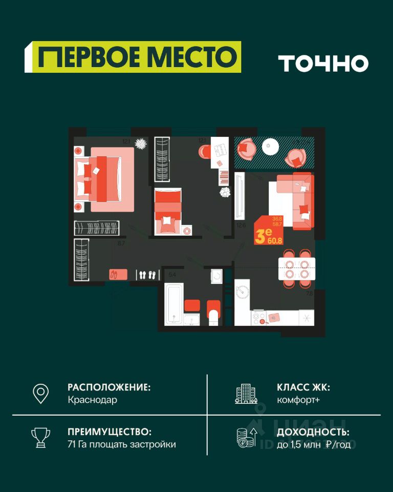 Жилой район "Первое место"- один из самых масштабных проектов в России. На территории 71 га 18 кварталов, 31 дом переменной этажности от 8 до 18 этажей, собственный парк 9 га, храмовый комплекс, пешеходный бульвар "Круг семьи", детские и спортивные площадки, мангальные зоны и различные локации для отдыха. В шаговой доступности действующие муниципальные образовательные учреждения: школа на 1 100 мест и детский сад на 250 мест. Помимо этого, в жилом районе "Первое место" построятся школа на 1700 мест с крытым 25-метровым бассейном и 5 детских садов на 1 490 мест. На первых этажах многоуровневых парковок "паркхабов" разместится более 61 тыс м2 коммерческих помещений. Жителям будут доступны собственный фитнес-центр, кафе, рестораны и магазины. В каждом подъезде предусмотрены дизайнерские холлы в стиле лобби отелей, консьерж-сервис, лапомойки, отдельные колясочные и велосипедные. Также в домах будут просторные кладовые помещения и комнаты для хранения почты с почтоматами для получения посылок из маркетплейсов.