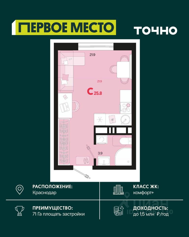 Жилой район "Первое место"- один из самых масштабных проектов в России. На территории 71 га 18 кварталов, 31 дом переменной этажности от 8 до 18 этажей, собственный парк 9 га, храмовый комплекс, пешеходный бульвар "Круг семьи", детские и спортивные площадки, мангальные зоны и различные локации для отдыха. В шаговой доступности действующие муниципальные образовательные учреждения: школа на 1 100 мест и детский сад на 250 мест. Помимо этого, в жилом районе "Первое место" построятся школа на 1700 мест с крытым 25-метровым бассейном и 5 детских садов на 1 490 мест. На первых этажах многоуровневых парковок "паркхабов" разместится более 61 тыс м2 коммерческих помещений. Жителям будут доступны собственный фитнес-центр, кафе, рестораны и магазины. В каждом подъезде предусмотрены дизайнерские холлы в стиле лобби отелей, консьерж-сервис, лапомойки, отдельные колясочные и велосипедные. Также в домах будут просторные кладовые помещения и комнаты для хранения почты с почтоматами для получения посылок из маркетплейсов.