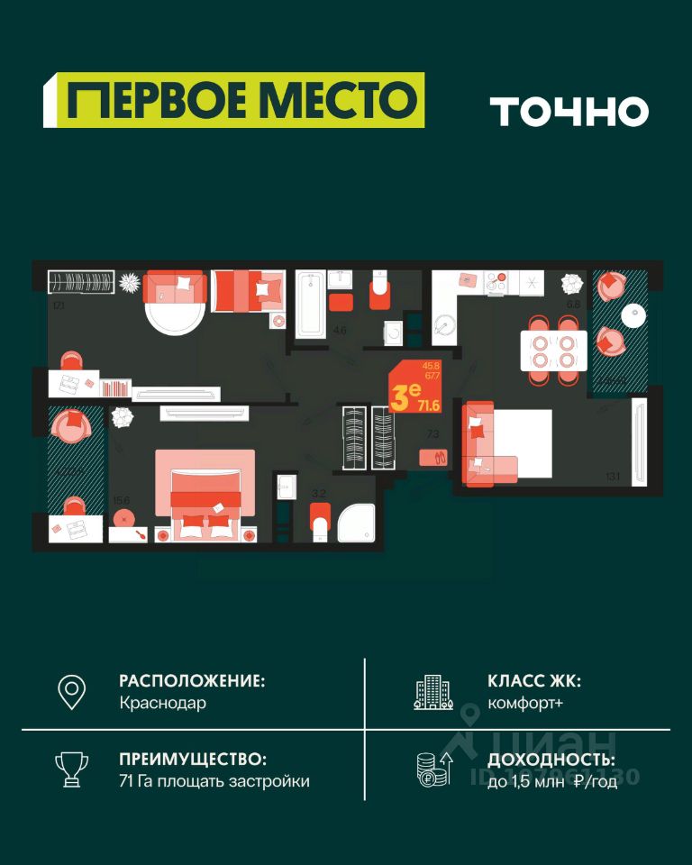 Жилой район "Первое место"- один из самых масштабных проектов в России. На территории 71 га 18 кварталов, 31 дом переменной этажности от 8 до 18 этажей, собственный парк 9 га, храмовый комплекс, пешеходный бульвар "Круг семьи", детские и спортивные площадки, мангальные зоны и различные локации для отдыха. В шаговой доступности действующие муниципальные образовательные учреждения: школа на 1 100 мест и детский сад на 250 мест. Помимо этого, в жилом районе "Первое место" построятся школа на 1700 мест с крытым 25-метровым бассейном и 5 детских садов на 1 490 мест. На первых этажах многоуровневых парковок "паркхабов" разместится более 61 тыс м2 коммерческих помещений. Жителям будут доступны собственный фитнес-центр, кафе, рестораны и магазины. В каждом подъезде предусмотрены дизайнерские холлы в стиле лобби отелей, консьерж-сервис, лапомойки, отдельные колясочные и велосипедные. Также в домах будут просторные кладовые помещения и комнаты для хранения почты с почтоматами для получения посылок из маркетплейсов.
