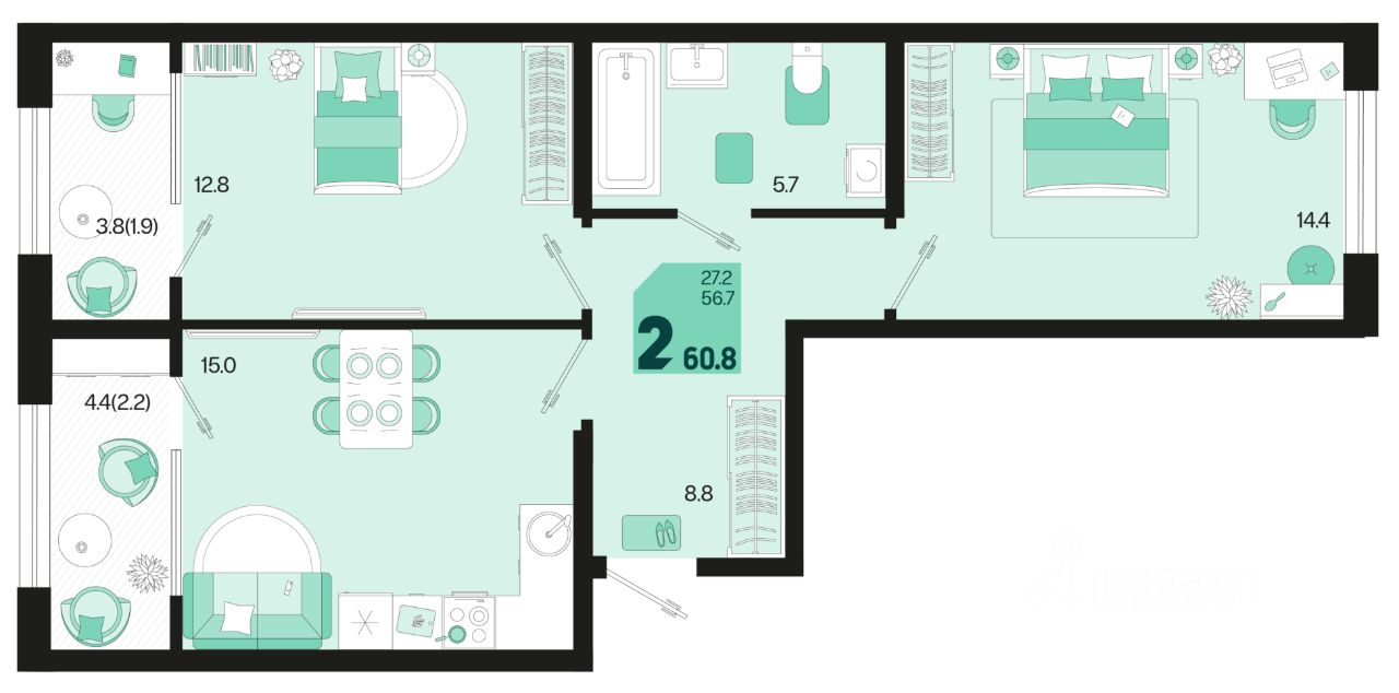 Общая площадь60,8 м²