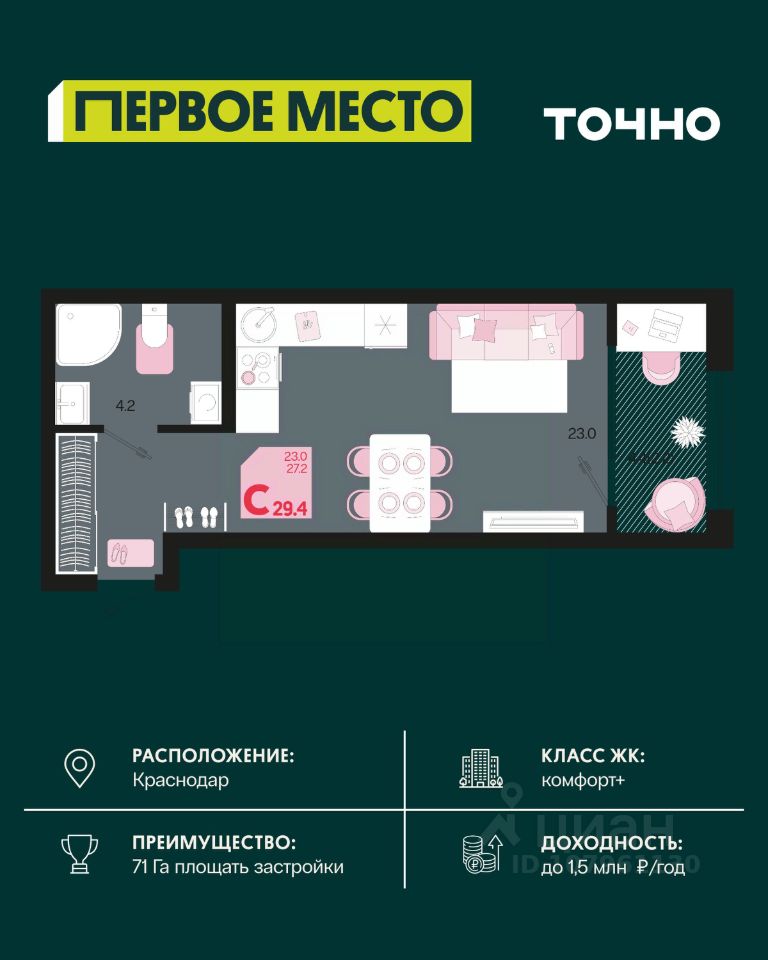 Жилой район "Первое место"- один из самых масштабных проектов в России. На территории 71 га 18 кварталов, 31 дом переменной этажности от 8 до 18 этажей, собственный парк 9 га, храмовый комплекс, пешеходный бульвар "Круг семьи", детские и спортивные площадки, мангальные зоны и различные локации для отдыха. В шаговой доступности действующие муниципальные образовательные учреждения: школа на 1 100 мест и детский сад на 250 мест. Помимо этого, в жилом районе "Первое место" построятся школа на 1700 мест с крытым 25-метровым бассейном и 5 детских садов на 1 490 мест. На первых этажах многоуровневых парковок "паркхабов" разместится более 61 тыс м2 коммерческих помещений. Жителям будут доступны собственный фитнес-центр, кафе, рестораны и магазины. В каждом подъезде предусмотрены дизайнерские холлы в стиле лобби отелей, консьерж-сервис, лапомойки, отдельные колясочные и велосипедные. Также в домах будут просторные кладовые помещения и комнаты для хранения почты с почтоматами для получения посылок из маркетплейсов.