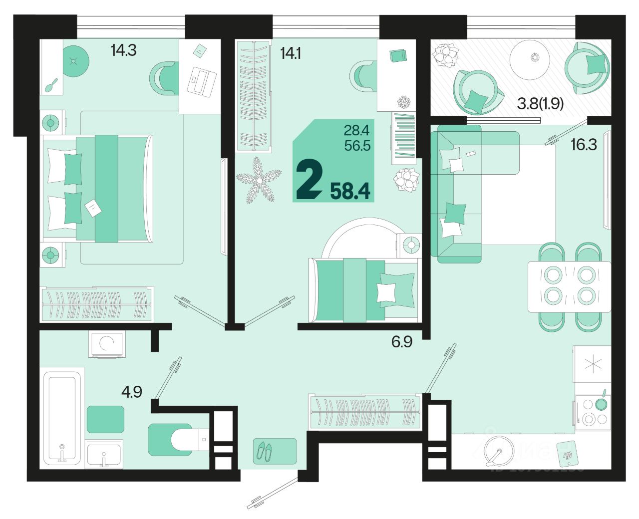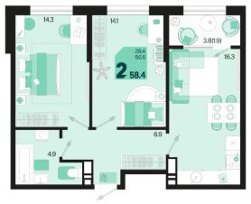 Общая площадь58,4 м²