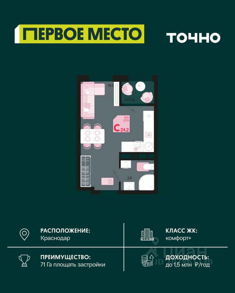 Жилой район "Первое место"- один из самых масштабных проектов в России. На территории 71 га 18 кварталов, 31 дом переменной этажности от 8 до 18 этажей, собственный парк 9 га, храмовый комплекс, пешеходный бульвар "Круг семьи", детские и спортивные площадки, мангальные зоны и различные локации для отдыха. В шаговой доступности действующие муниципальные образовательные учреждения: школа на 1 100 мест и детский сад на 250 мест. Помимо этого, в жилом районе "Первое место" построятся школа на 1700 мест с крытым 25-метровым бассейном и 5 детских садов на 1 490 мест. На первых этажах многоуровневых парковок "паркхабов" разместится более 61 тыс м2 коммерческих помещений. Жителям будут доступны собственный фитнес-центр, кафе, рестораны и магазины. В каждом подъезде предусмотрены дизайнерские холлы в стиле лобби отелей, консьерж-сервис, лапомойки, отдельные колясочные и велосипедные. Также в домах будут просторные кладовые помещения и комнаты для хранения почты с почтоматами для получения посылок из маркетплейсов.