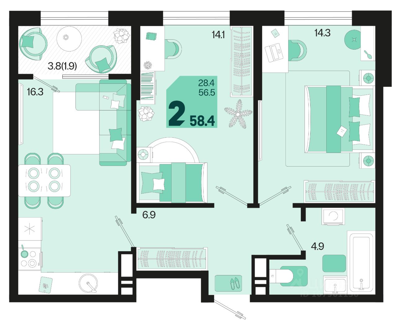 Общая площадь58,4 м²